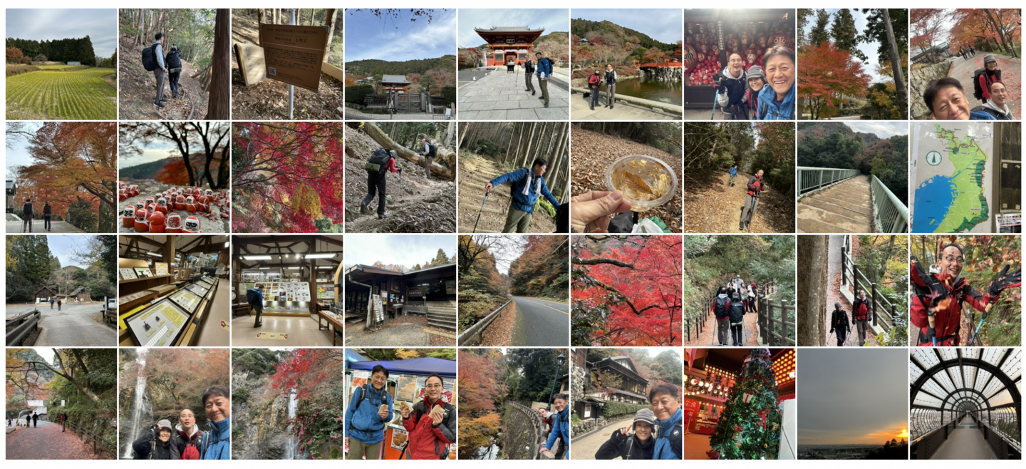 今回の山行は、箕面外院からスタート。自然豊かな道を通り、まず勝尾寺を経由します。勝尾寺は勝運祈願で有名な寺院で、美しい庭園と荘厳な雰囲気が魅力です。そこから山道を進むと、歴史的な開成皇子の墓に到着。ここが最勝が峰の標高660Mの山頂。木立に囲まれ静寂の中で歴史を感じられるスポットです。その後、箕面大滝に向かい、途中、一面落ち葉の絨毯のところでお弁当を食べ、落差33mの滝の雄大な景観を楽しみました。滝付近は紅葉の名所でもあり、今年は12月半ばで紅葉を見られ最高でした。最後に箕面駅付近へ下山し、充実した1日を締めくくることができました。今回が今年最後の山行となりました。<時間6時間/距離11.1Km/のぼり677m/くだり641m>