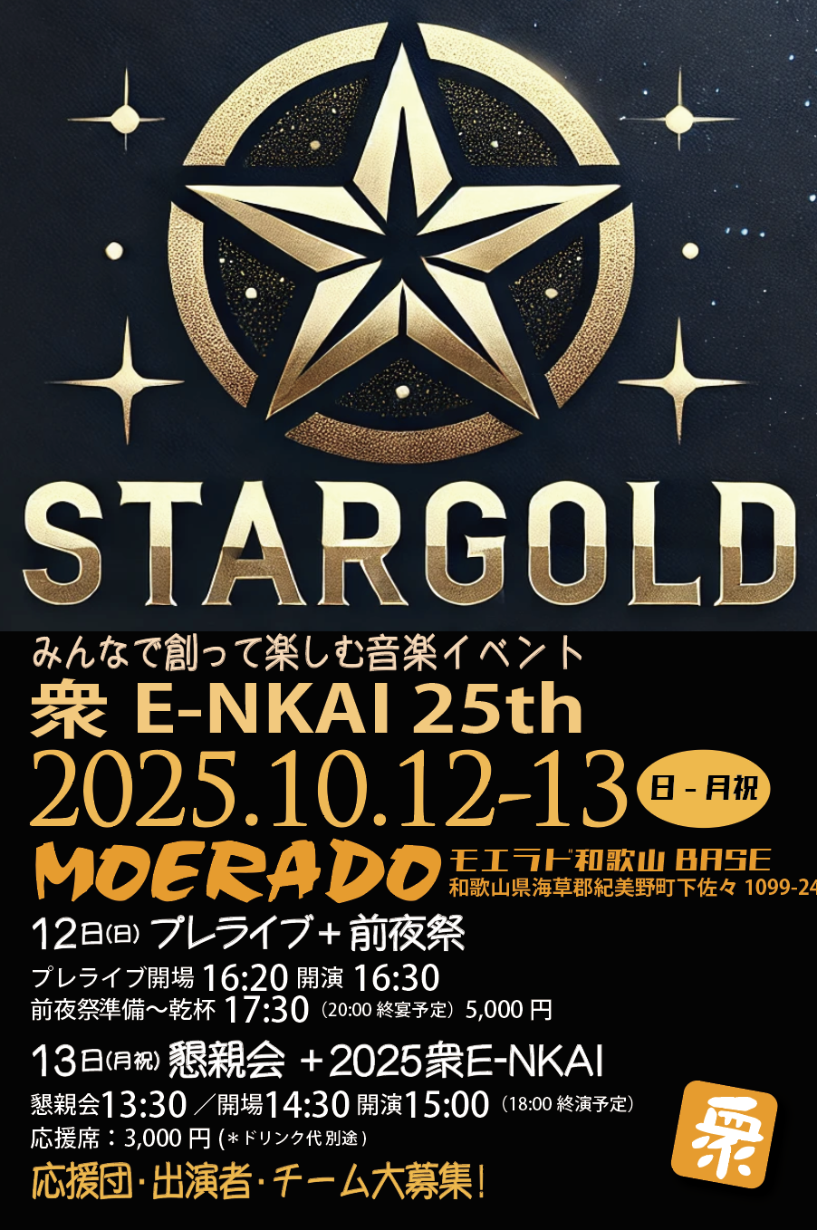 頭を垂れた稲穂に星々が語りかける。 「そろそろ黄金に輝いてもよいぞ」と。 今をゴールデンタイムと言わずして、いつ言う。そうだ、決戦は金耀日、ちなみに今日は月曜日。金星の輝きも増し、金糸雀(カナリア)のさえずりが響く紀美野町で、一際目を引く建物、それはきっと黄金比にちがいないビルヂング。「モエラド」が、ゴールドラッシュのごとき熱狂に包まれるひととき。それは、金箔のように煌めくステージ!我らが衆「E-NKAI」。
