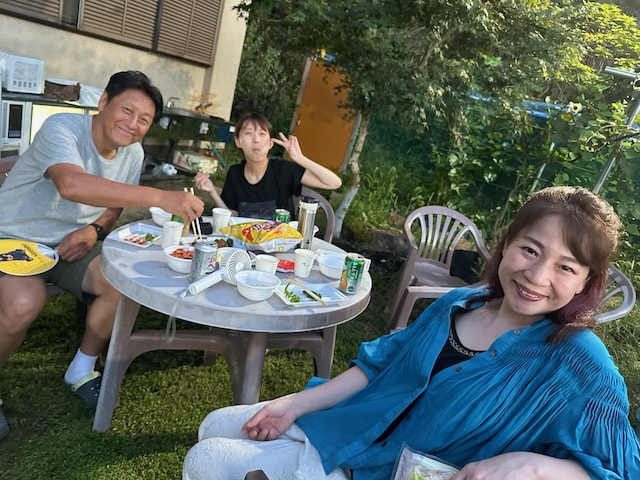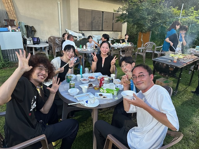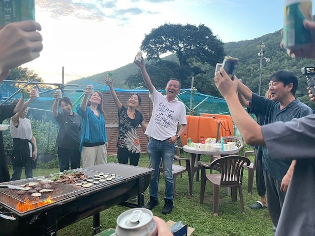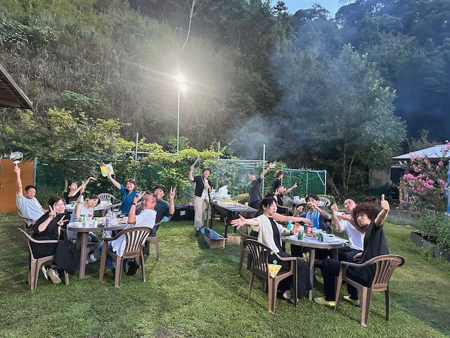 プレライブの後は、お楽しみ前夜祭BBQ!自然に囲まれた紀美野町「MOERADO」のお庭で、笑い声と煙が立ち上る最高の時間。テンションMAXのテーブル、アットホームな雰囲気の中、チームの結束もバッチリ!この勢いでライブ成功まちがいなし!