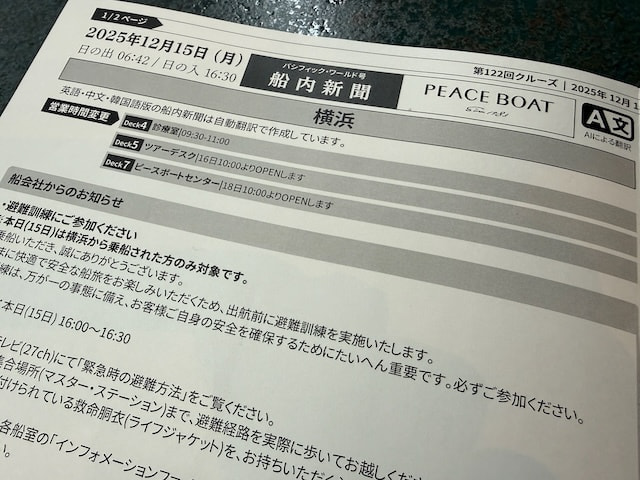 日が暮れるころ、各部屋のポストに船内新聞が届く。